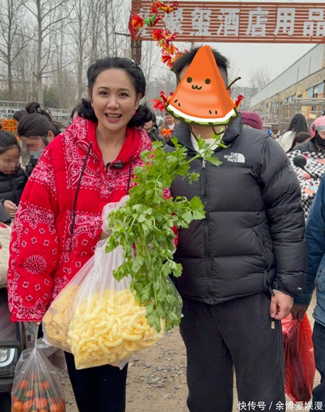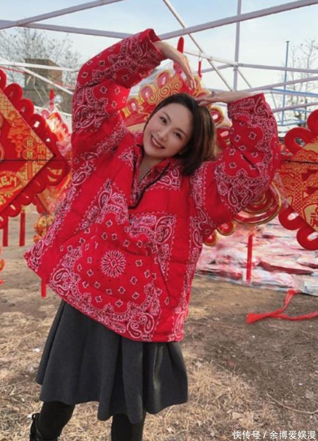 郭晓东一身亮绿羽绒服配做旧牛仔裤,灰帽子黑围巾,活脱脱就是回村过年的本地小伙儿。51岁的他素颜出镜,皮肤黝黑,笑纹清晰可见,却透着一股踏实劲儿。程莉莎更是一身喜庆红衣,那件印花上衣还是23年穿过的“老朋友”,手里提着大包小包,脸上虽有岁月留下的细纹,但状态在同龄人里绝对算亮眼。